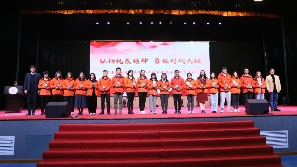 学校党委书记李先祥、校长夏伟为援鄂校友颁发纪念品