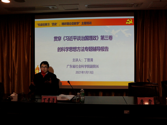 1月13日,培训以省社会科学院丁晋清副院长的“贯穿《习近平谈治国理政》(第三卷)的科学思想方法”及“申报思政课题应遵循的基本原则”两场报告拉开序幕。丁晋清副院长结合自己的学习体会,总结了贯穿《习近平谈治国理政》(第三卷)的八种科学思想方法、六种科学思维能力、三种科学理念,讲座系统性强,信息量大,理论分析透彻,讲解生动深刻,为老师们悦读经典习“四史"提供了系统科学的学习方法。在第二场报告中,丁晋清副院长认为,申报课题要成功,一是要遵循学术规范;二是要结合中心工作,结合习近平总书记新思想挖掘选题;三是要发挥自己的专业优势,做到扬长避短;四是要有特色和创新,避免雷同和炒冷饭;五是要站在学术前沿;六是要有一定的学术积淀;七是要有问题意识。同时,丁晋清副院长根据以上原则,围绕学习党的十九届五中全会精神、建党100周年、顺德高质量发展等即时提供了十二个选题供大家参考,为老师们的课题申报提供极大帮助。大家普遍认为该报告及时给力,使人受益匪浅。