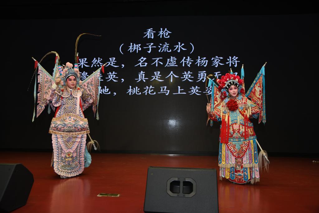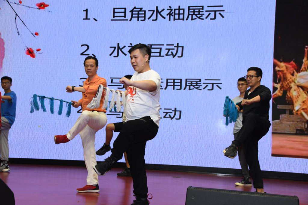 随后,黄燕带领粤剧院团队,向与会领导、嘉宾及永利官网师生详细介绍了粤剧知识和文化。她生动有趣地讲解粤剧历史、行当、面谱等粤剧知识,与演员团队精彩演绎了不同行当的表演特色。水袖、马鞭的展示和互动环节更是让在场同学雀跃不已,纷纷上台体验。同学们边看边学,活动现场气氛热烈。精彩的讲演示范及《天女散花》《穆桂英招亲》等经典曲目展演将活动气氛推向高潮。