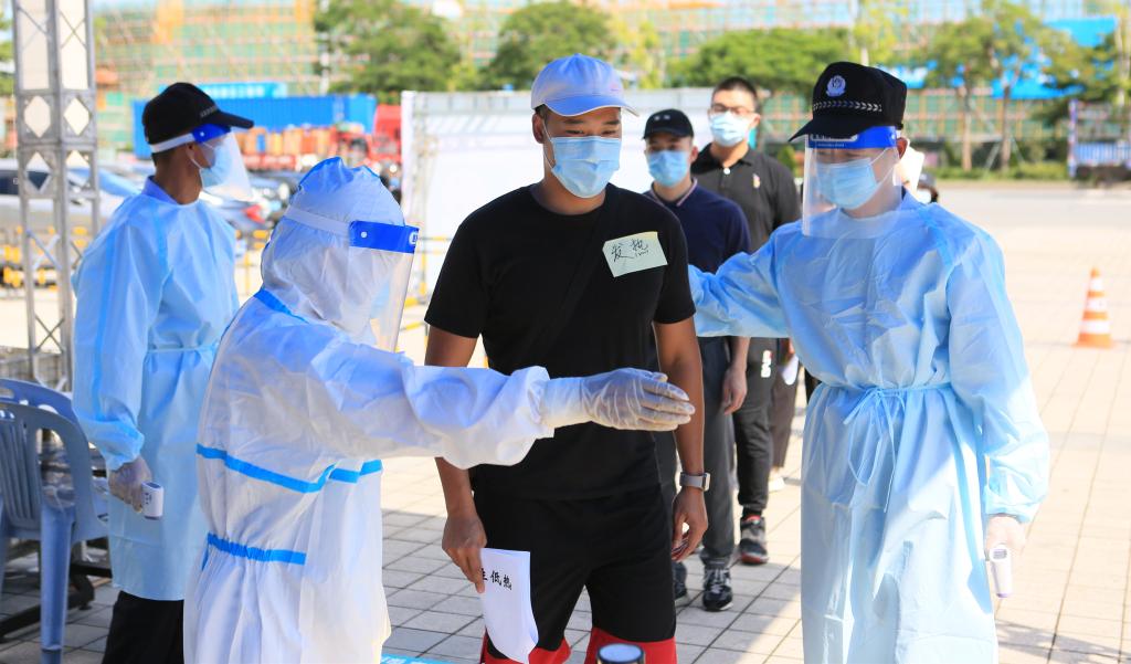 模拟有学生体温初测“发热”,医护人员将其带离至医学临时观察点