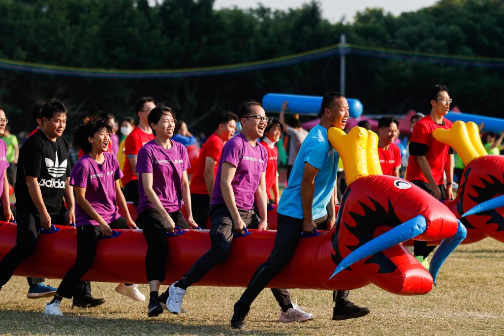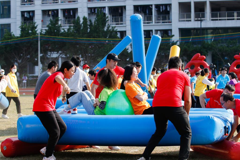 运动会期间,同时举办了教职工趣味运动会,设置“枕头大战”“标杆传递”“借木移舟”等6个集体项目和“快乐大脚”“足球飞镖”“一锤定音”等12个个人项目。全校教职工积极参与,将趣味与运动结合,其乐融融,收获满满。