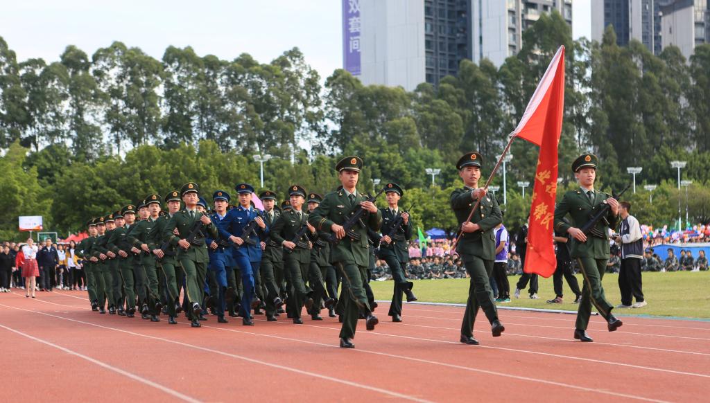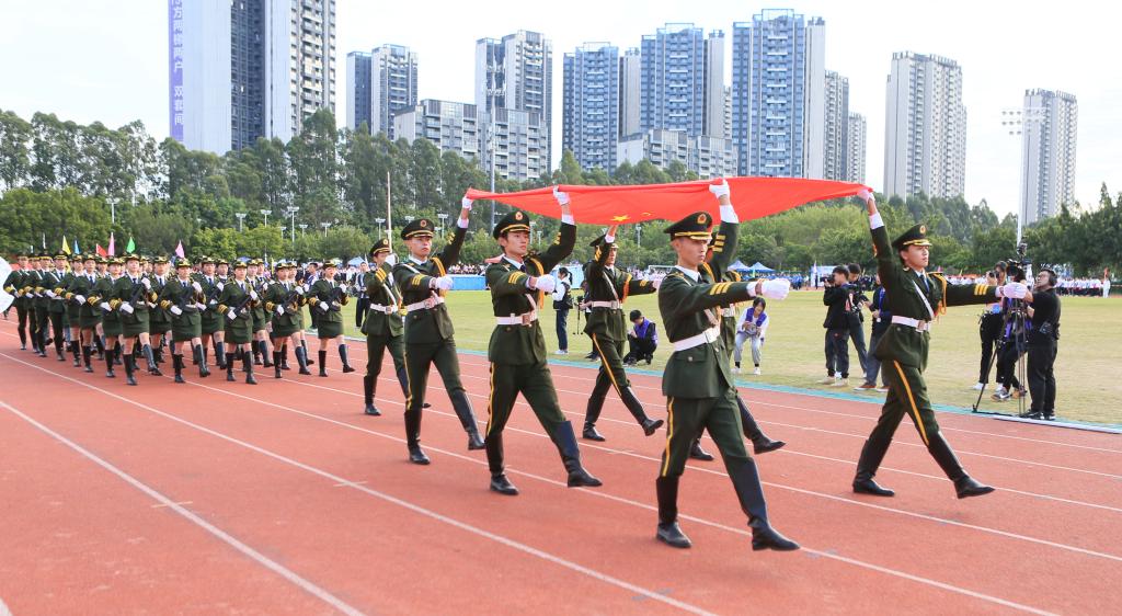 11月18日上午8点,国旗护卫队、红星先锋队、教职工代表队、学生代表队、特色表演方队踏着有力的步伐、喊着嘹亮的口号依次入场,彰显出健康向上的精神风貌和团结拼搏的青春风采。