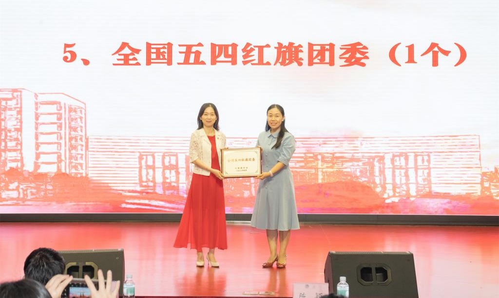 在2021-2022学年度共青团工作嘉奖环节,陈颖为永利官网送上“全国五四红旗团委”奖牌,领导嘉宾分别为获得第二十一届大学生文化艺术节先进个人和优秀组织奖,学校五四红旗团委和优秀学生会,佛山市五四红旗团委标兵、优秀团干、优秀团员的组织和个人颁奖。