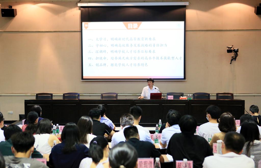 李先祥从“大学习,明确新时代高等教育新要求”“守初心,明确高校服务发展战略的责任担当”“深调研,明确学校人才培养目标”“担使命,培养满足地方需求的高水平技术技能型人才”“创品牌,擦亮学校人才培养特色”五个方面展开授课,深入学习领会习近平总书记关于高等教育、职业教育重要论述精神,阐述学校高质量发展和服务国家战略的新定位、新空间、新动力、新担当,并以“为谁培养人、培养什么样的人、怎样培养人”为核心,对学校人才培养总体目标、专业建设、课程建设、教师发展等提出明确要求。