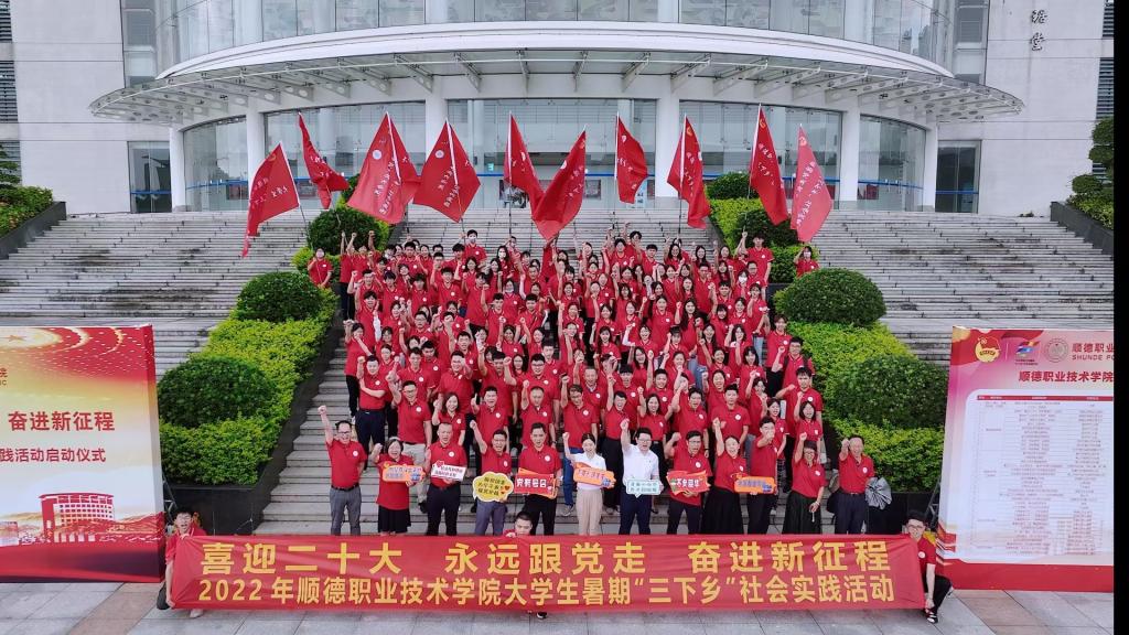 2022年,学校以习近平新时代中国特色社会主义思想为引领,以“喜迎二十大 永远跟党走 奋进新征程”为主题,组织123支团队奔赴全国多地,投身教育关爱、爱心医疗、水体治理、科技支农等领域,形成了“工作有章法、实践有特色、学生有成长”的“三下乡”社会实践“三有模式”,引领广大青年在青春的赛道上奋力跑出最好成绩。同时,学校发挥“专业+”优势,形成“百团千人下乡”。其中,“顺小旅”“粤顺厨”“推普”等实践团携手港澳青年赴贵州进行普通话推广、非遗宣传、粤菜推广;“佛山大城工匠与甘肃培黎职院、顺德职院协同培养实践团”20名成员赴企业实践15天;“青年粤菜师傅”走访暨南大学、广州永庆坊等地学习党史,宣传弘扬新时期广东精神。