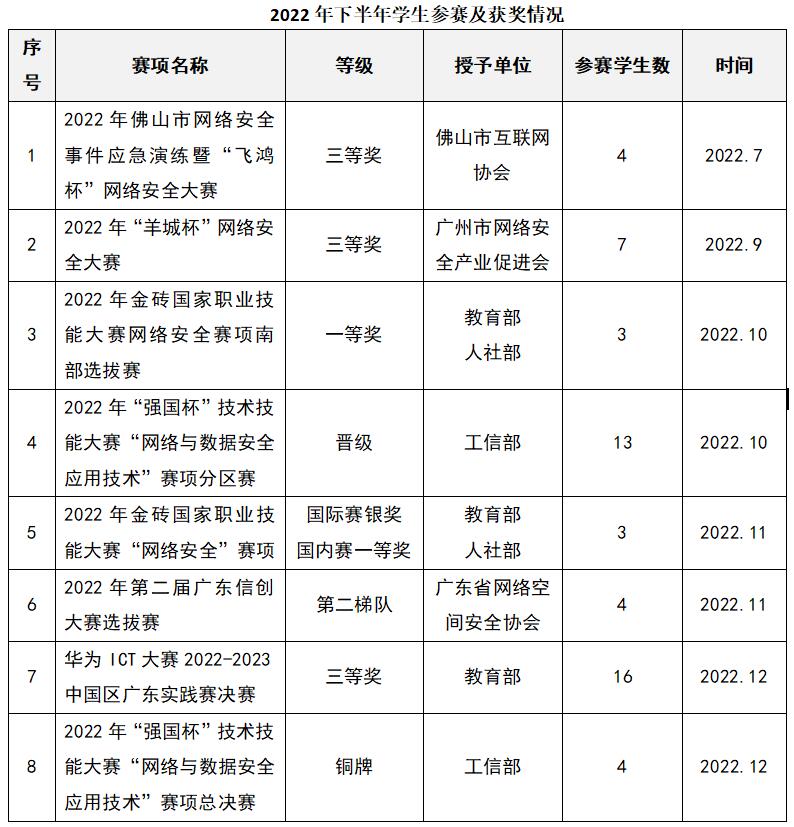 今年下半年以来,智能制造学院成立网络安全协会,组织学生参加金砖职业技能大赛“网络安全”赛项,以及“飞鸿杯”、“强国杯”、“羊城杯”、“友谊杯”、“鹏程杯”等多项网络安全类技能大赛取得佳绩。
