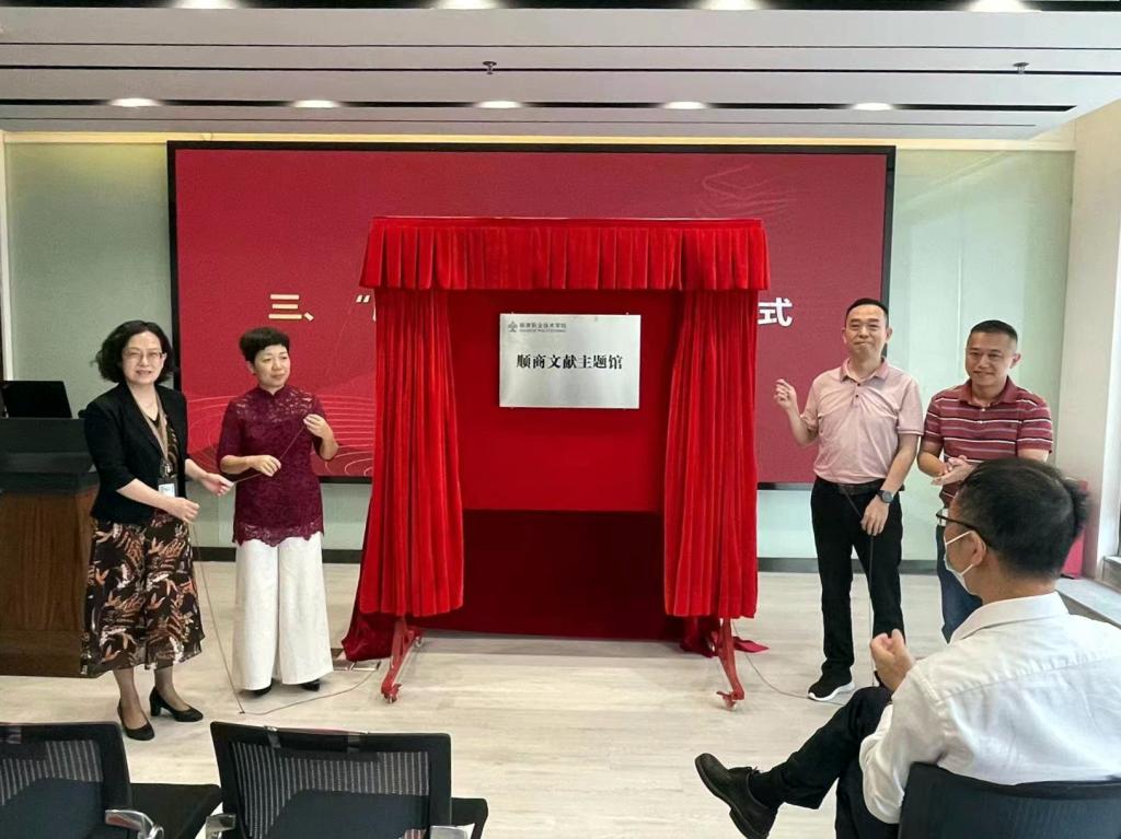 会上,学校和顺商发展研究会签订了校企共建“顺商文献主题馆”协议,双方代表为“顺商文献主题馆”揭牌。顺商文献主题馆将以文献资源为基础,融入顺德企业元素,弘扬顺商精神,传播顺商文化,为学校师生、企业读者提供服务。