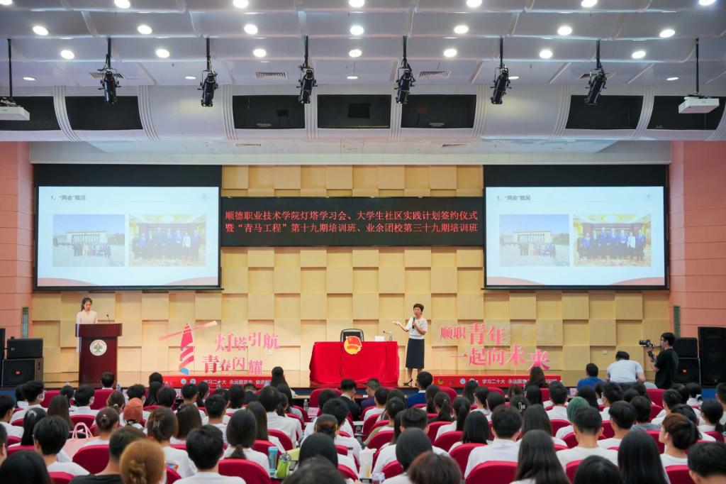 为深入学习贯彻党的二十大精神,落实立德树人根本任务,引导大学生厚植家国情怀、涵养进取品格,培养有理想、敢担当、能吃苦、肯奋斗的新时代好青年,5月29日下午,灯塔学习会、“青马工程”第十九期培训班、业余团校第三十九期培训班暨“大学生社区实践计划”结对共建签约仪式在永利官网一号学术报告厅举行。佛山团市委副书记陈颖、顺德团区委副书记贾菁岚、学校副校长罗丹,校团委负责人、各二级学院团干及学生骨干300多人参加活动。