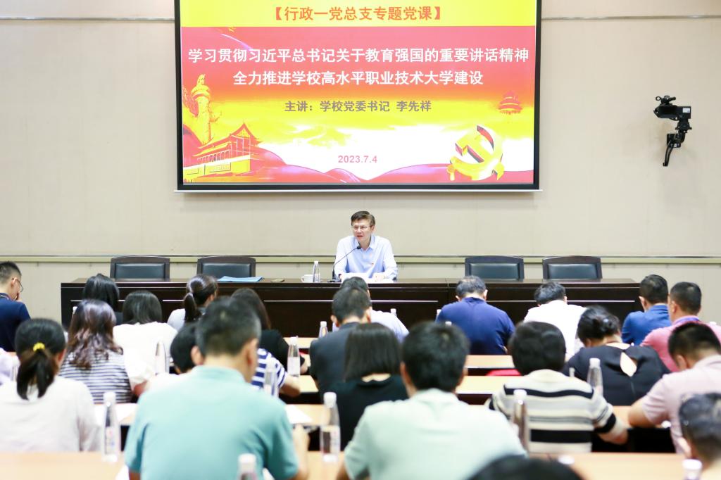 7月4日下午,行政一党总支在学术交流中心三号报告厅召开党员大会暨专题党课。学校党委书记李先祥以“学习贯彻习近平总书记关于教育强国的重要讲话精神,全力推进学校高水平职业技术大学建设”为主题,给行政一党总支全体党员、党员发展对象、入党积极分子上了一堂生动的专题党课。