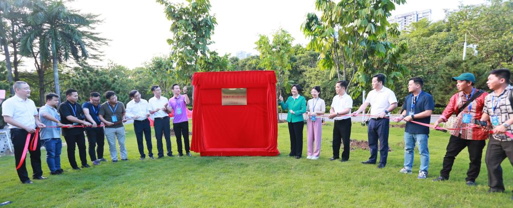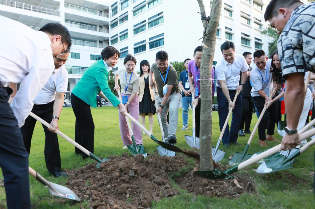 秋日的顺职校园,金风送爽,郁郁葱葱。在设计学院楼旁草地,大家挥动铁锹,培土固苗,接连种下6株无忧树。这种树原产东南亚,树形美观、枝叶深密,其幼叶形如花穗成串,状似无忧无虑。在大家的协作配合下,一棵棵树苗扎根沃土,迎风摇曳,为校园增添了盎然生机。随后,领导嘉宾与印尼华裔青年代表为“绿美广东-侨心林”揭牌并合影留念。