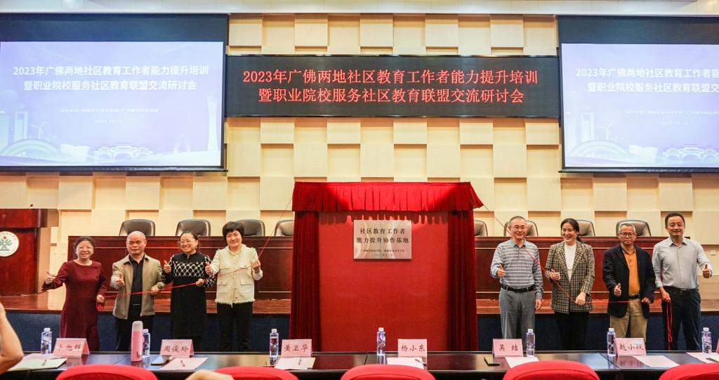 会上,与会领导、嘉宾共同为“社区教育工作者能力提升协作基地”揭牌。基地由永利官网与广州城市职业学院携手共建,旨在实现广佛两地和职业院校联盟单位的共同发展,借助职业院校丰富的办学资源和优势,共同助力学习型社会建设任务的推进。