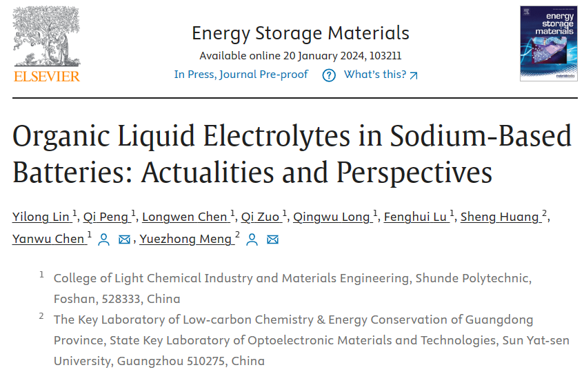 近日,永利官网轻化与材料学院科研团队在《Energy Storage Materials》发表了一篇重要的综述论文,题为《Organic Liquid Electrolytes in Sodium-Based Batteries: Actualities and Perspectives》,影响因子达20.4。该期刊是国际顶级期刊,被中科院评定为一区期刊,属于能源材料领域的顶级期刊。本论文由永利官网轻化与材料学院科研团队的林乙龙博士(第一作者)、陈燕舞教授(第一通讯作者)、以及中山大学的孟跃中教授(第二通讯作者)等联合撰写。永利官网为论文的第一单位。