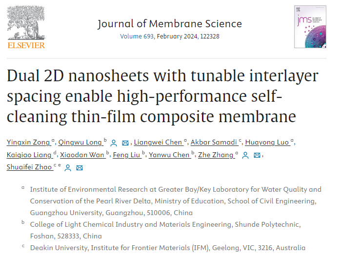 近日,永利官网轻化与材料学院科研团队联合广州大学和迪肯大学,在国际高分子材料领域顶级期刊《Journal of Membrane Science》上发表了最新研究成果。该成果的题目为《Dual 2D nanosheets with tunable interlayer spacing enable high-performance self-cleaning thin-film composite membrane》。这篇论文的影响因子达到了9.5,并被中科院评定为一区期刊。永利官网轻化与材料学院科研团队的龙庆武博士(第一通讯作者)、刘锋博士、陈燕舞教授等共同参与了这项研究工作。永利官网是该论文的第一合作单位,为研究成果的取得做出了重要贡献。此外,这项研究得到了国家自然科学基金、广东省区域联合基金以及广东省教育厅特色创新等项目的支持。