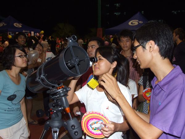 活动现场张灯结彩,喜气洋洋的大红灯笼和数百个款式新颖的小灯笼格外抢眼,处处洋溢着节日的喜庆氛围。十个摊位各显奇招,“海底捞月”、“正话反说”、“摸摸猜”、“花容月貌”等活动项目让师生们尽享游园乐趣,妙趣横生的“中秋灯谜你我一起猜”让师生们满载而归,“我与月亮有个约会”活动借助天文望远镜让众多师生近距离欣赏月容。多名外教在学生的欢呼声中用中文对大家说出“中秋节快乐”,师生们欢声笑语不断,场面热闹非凡。