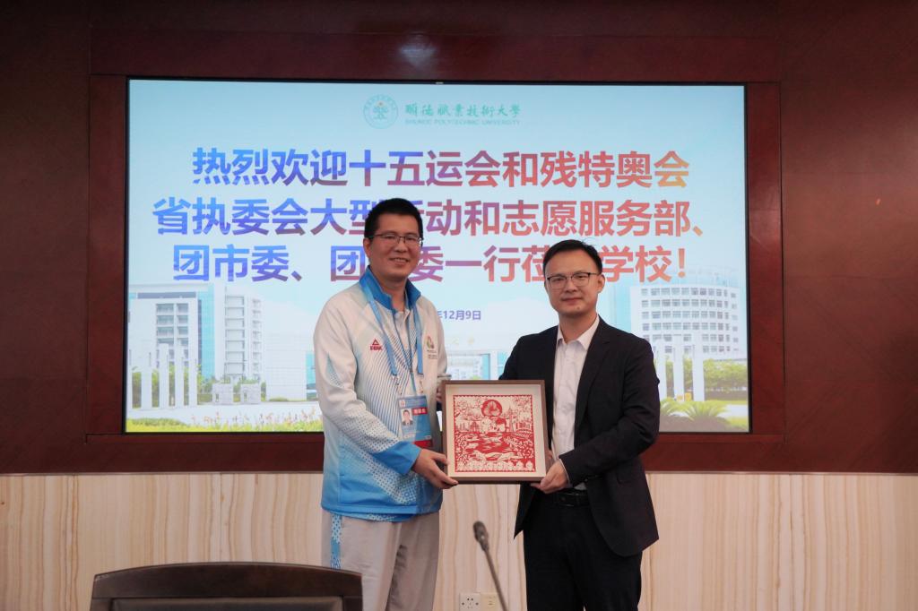 朱瑞峰对永利官网赛会志愿服务的组织工作和志愿者的优异表现给予高度肯定。他指出,大型赛会志愿服务是重要的实践育人平台,赛会志愿者在保障赛会顺利举办的同时,更要努力实现“助人”与“自助”的双重收获。要强化赛会志愿服务中的思想政治引领,将党建、团建与志愿服务深度融合,发挥好赛会志愿服务育人功能;同时要加强宣传工作,讲好残特奥会顺职大志愿者故事。结束之际,李天赠代表学校向调研组赠送魅力湾区红色顺德非遗剪纸。