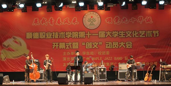宣誓仪式后,来自广州星海音乐学院的Maple Jazz Band为大家带来了爵士音乐会,他们改编、演奏和演唱了《Home》、《This Love》、《听海》等歌曲,并向师生传授爵士音乐知识和各类乐器的特性等知识,让师生们再一次近距离接触爵士音乐。