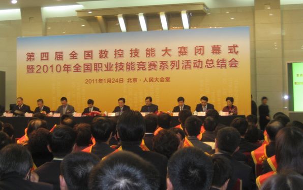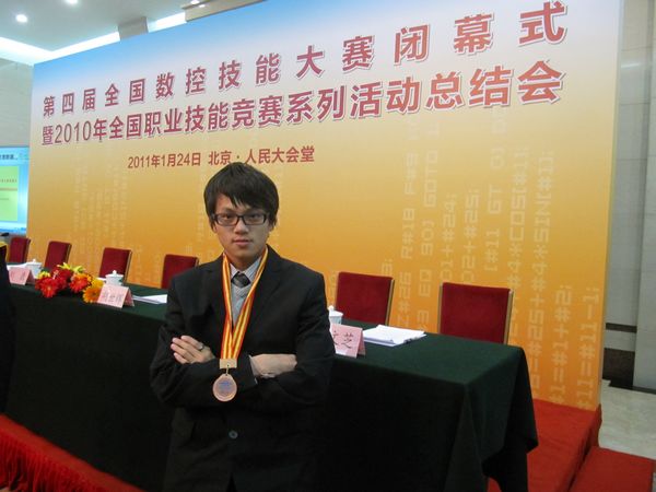 2011年1月24日,在北京人民大会堂隆重举行了第四届全国数控技能大赛闭幕式暨2010年全国职业技能竞赛系列活动总结会。人力资源和社会保障部副部长信长星出席大会作重要讲话,并为获奖团体和个人颁奖。永利官网机电系学生刘振锋同学获得此次全国大赛(总决赛)第五名的好成绩,与指导老师李文辉一起,作为获奖选手代表团成员赴北京参加了颁奖典礼。