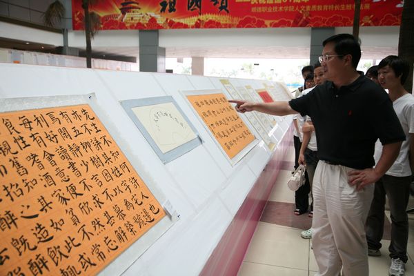 10月25日下午,夏伟院长参观了由人文教育系主办的“庆祝新中国成立61周年——‘祖国颂’人文素质教育特长生班书法展”,并与陪同参观的师生进行了互动和交流。