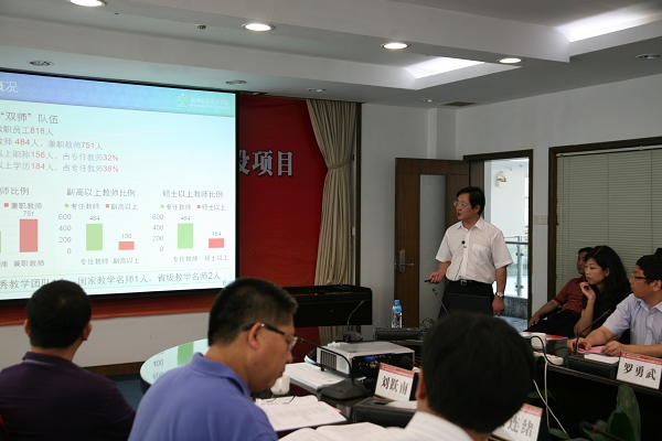7月2日上午8:20,专家组一行首先参观了学校的校内实训基地与建设成果。九点整,在行政楼508召开国家重点培育高等职业院校建设项目工作汇报会。会议首先由省财政厅教科文处副处长詹俊青主持,基财处处长蔡文雅代表广东省教育厅致辞,她充分肯定了学校在探索校企合作办学体制机制、工学结合人才培养模式、增强社会服务能力等方面取得的成绩,表示将一如既往地支持学校的建设和发展。顺德区副区长、顺德区教育局局长曹洪彬发表了讲话,他表示政府全力支持学校建设重点培育院校,全面落实各项承诺;他鼓励学校以验收为契机,继续发扬敢闯敢试、敢为天下先的传统,为高职教育的发展做出更大的贡献。