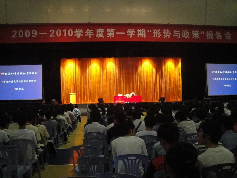 报告会的主题是《中国道路·中国经验·中国模式》,由华南师范大学政治与行政学院副院长、博士生导师陈金龙教授主讲。报告分为三部分,即新中国前30年的发展道路与发展经验、改革开放30年的发展道路与发展经验、中国模式。报告以丰富的事例,生动的语言和详实的数据,从经济、政治、文化、社会等方面深刻分析了新中国前30年和改革开放30年的发展道路与发展经验,展示了新中国60年的辉煌成就,展现了中国模式的独特魅力,让同学们享受了一次文化盛宴。