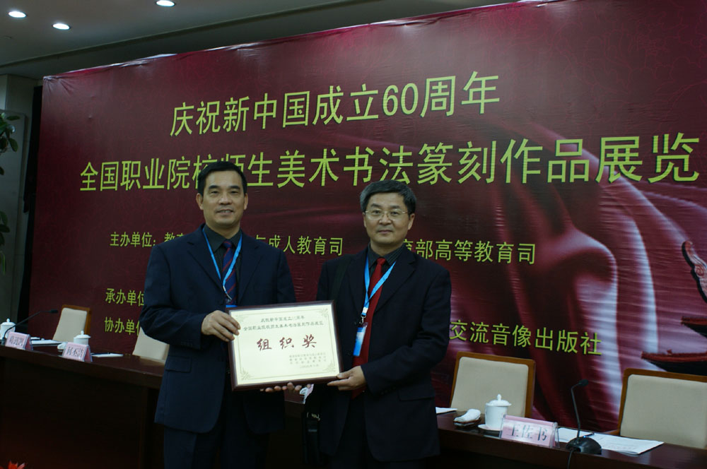 由教育部职业教育与成人教育司、教育部高等教育社、中华职业教育社联合发起的“庆祝新中国成立60周年全国职业院校师生美术书法篆刻作品展览”评选活动,在一千多幅作品中经过层层选拔,永利官网选送的23幅书画作品有13件获奖,永利官网同时喜获全国“组织奖”,人文教育系陈建华主任喜获“特别荣誉奖”。