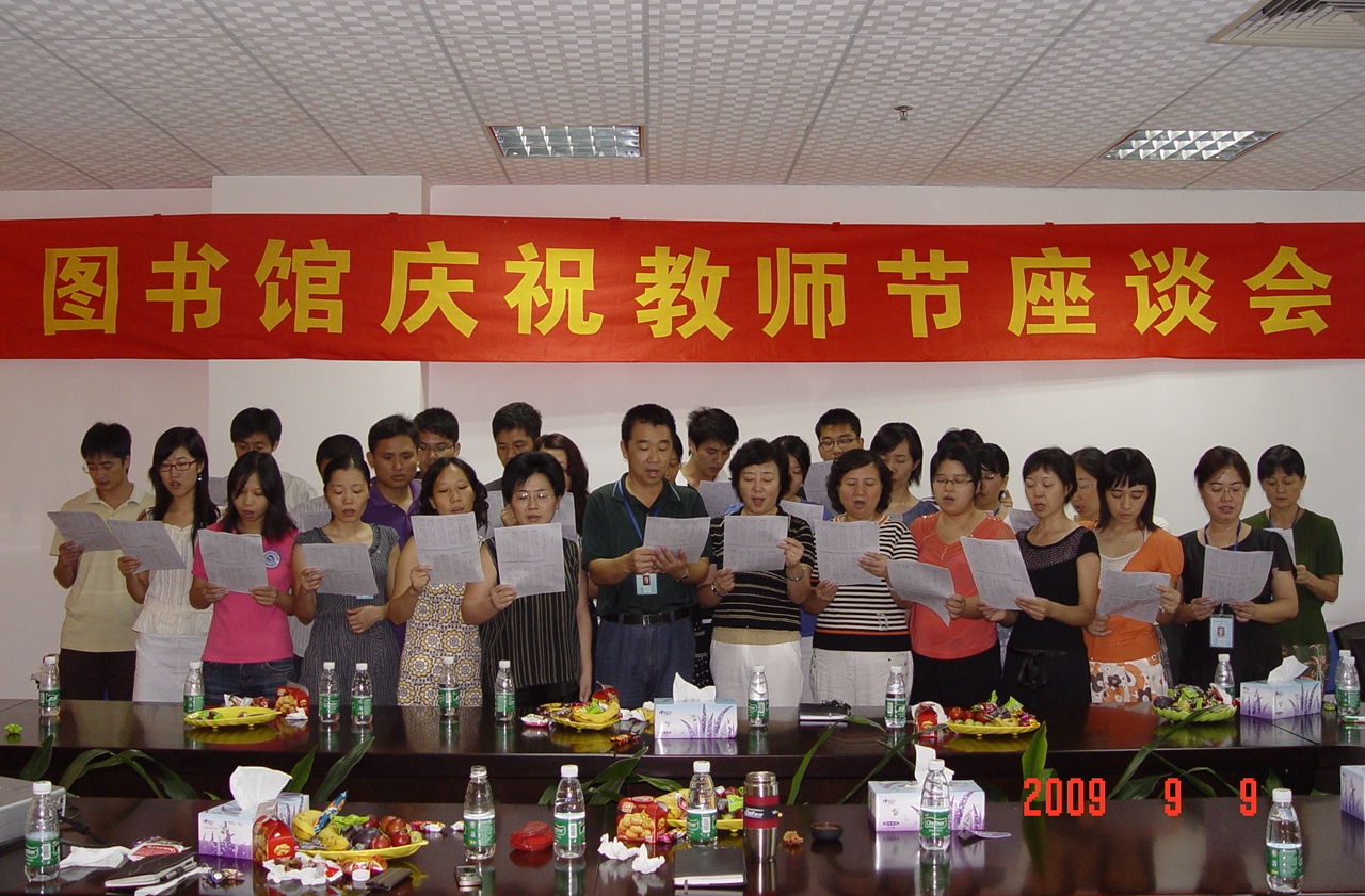 金秋九月,丹桂飘香,辛勤的园丁迎来了第25个教师节。今天,为了庆祝教师自己的节日,图书馆全体馆员齐聚一堂,举办了图书馆2009教师节座谈会。共同抒发了欢乐的情怀。