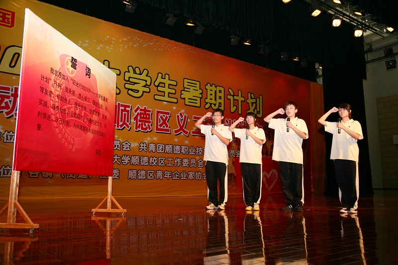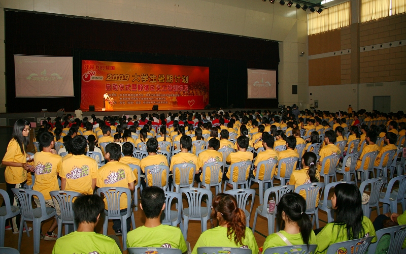 7月10日下午,以“爱我顺职 勇担使命 勤学励志 实践报国”为主题的2009年大学生暑期“三下乡”社会实践活动启动仪式在梁銶琚堂隆重举行。顺德区关心下一代工作委员会主任招汝基、团区委书记柯宇威、副书记容佰辉、区各基层团委负责人,四川省凉山州甘洛县团委书记阿西阿木,青年企业家协会会长吴兆恒、各青企协会会员企业代表,南方医科大学顺德校区代表,永利官网副院长何锐连、陈粟宋及本次社会实践活动的指导老师、学生义工700多名同学出席了本次启动仪式。