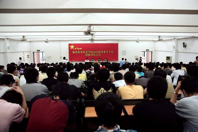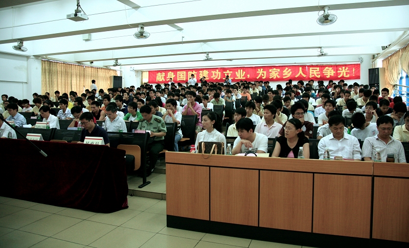 5月24日下午,我院在教学楼5300召开了2009届毕业生士官招收动员大会。顺德区武装部政治委员丁庚山上校,顺德区人民政府征兵办公室主任、区人民武装部黄敬军副部长;区教育局、公安分局、财政局、民政局、卫生局、劳动社会保障局、大良武装部、大良医院的有关领导出席本次活动。学院士官招收领导小组成员、电子工程系、机电工程系的书记、辅导员和部分班主任,及应届学生生共318人参加了本次动员会。会议由学生处周发新副处长主持。