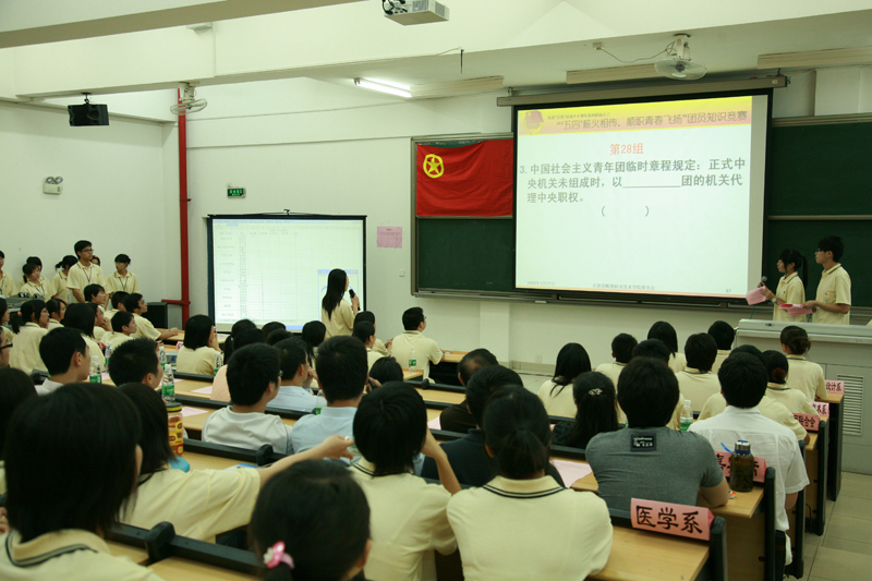 此次竞赛共有来自校团委、校学生会、校社团联合会和各系(二级学院)分团委的12支队伍参赛,各队参赛选手均是经过内部初赛选拔的佼佼者。竞赛分为必答题、风险题、起死回生、抢答题四个环节,现场气氛活跃,紧张刺激,掌声不断。经过激烈的角逐后,医学系脱颖而出荣获第一名,计算机技术系、校学生社团联合会、外语系分别荣获第二、三、四名。艺术设计系获得了“最佳组织奖”。