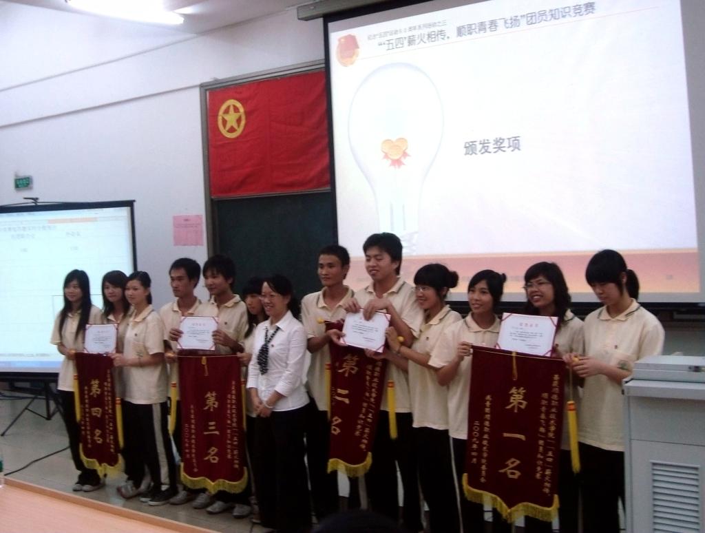 为了增强团员青年对团组织的认识和了解,激发广大青年学子的爱国热情,4月15日,校团委隆重举行了以“‘五四’薪火相传,顺职青春飞扬”为主题的团员知识竞赛。学院纪委谭谦章书记、党委宣传部刘晓顺部长、校团委陈曦书记、电子工程系石玉财书记、外语系陈春艳书记、校团委张业华副书记以及校团委、各系(二级学院)分团委老师出席了此次活动。