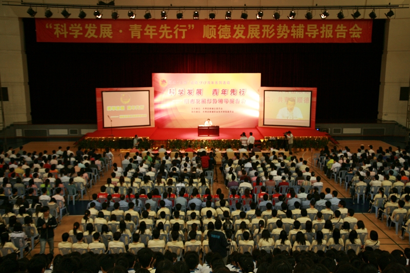 为纪念“五四”运动90周年,进一步弘扬“爱国、进步、民主、科学”的“五四”精神,同时在珠三角一体化和广佛同城化发展的新形势下,团结带领广大团员青年坚定信心,为实现顺德富裕和谐发展奉献青春和力量,佛山市市委常委、顺德区委书记、我院党委书记刘海于5月4日上午在我院梁銶琚礼堂,为全区各界青年代表作关于顺德科学发展形势的辅导报告。中共顺德区委常委、宣传部部长梁惠英,中共顺德区委常委、区委区政府秘书长杜镜初,学院领导陈智、邹时智、罗勇武、谭谦章、徐刚和2000多名师生出席了报告会。报告会由顺德团区委书记柯宇威主持。