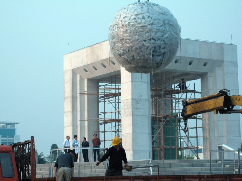 为了给十周年校庆献礼,经校园文化建设领导小组审批,几经咨询原设计、制造单位(清华工美)的具体意见。寒假期间,总务处组织相关人员对智慧球进行了全面整修。整修改造后的智慧球,外表采用银灰色氟碳漆,后作高温烘烤处理,固定牵缆采用直径为6.0mm坚朗牌不锈钢索。并按要求为球体减负,去掉严重锈蚀的电机、更换主轴和锈蚀的结构架,并作冲砂脱污处理,球重由原来的1000公斤减为650公斤,延长了使用寿命,增加了观赏性,新学期将以崭新的面貌呈现在广大师生员工面前。