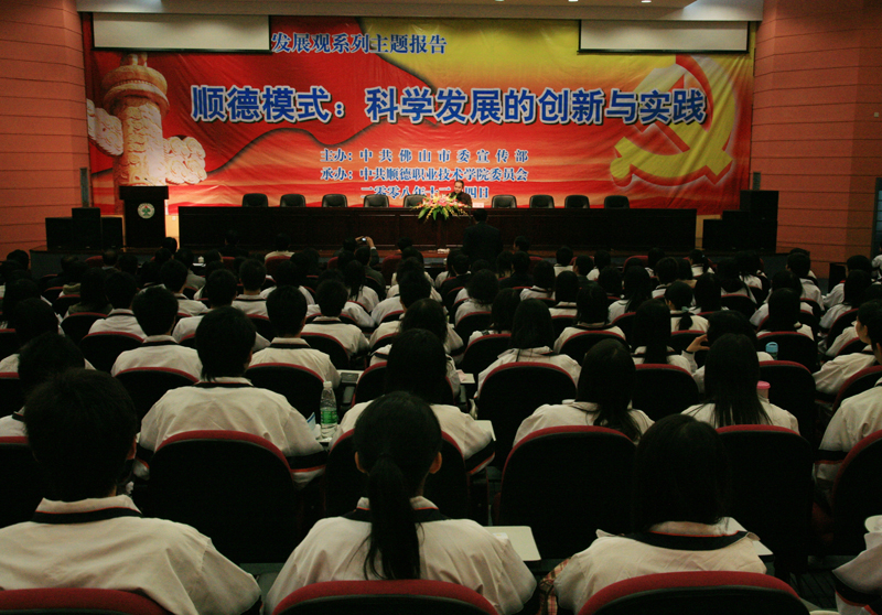 12月4日,我院召开深入学习实践科学发展观系列主题报告会,特邀顺德区委宣传部副部长沈涌同志做主题为“顺德模式:中国改革开放的区域创新实践”专题报告会。参加本次报告会的有佛山市委宣传部理论科主任科员姜腾云、经管学院院长高新和、学院党委宣传部全体成员、经管学院师生以及人文教育系、思政课部教师。会议由学院党委宣传部部长刘晓顺主持。