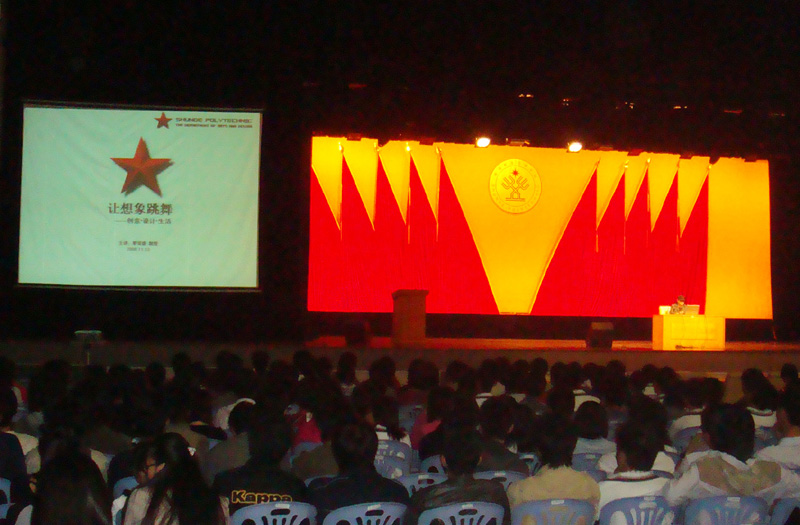 廖荣盛教授讲述了创意时代的来临,对国内外创意产业现状和发展、从“中国制造”到“中国创造”过程中的创意产业热、创意人才需求等问题进行了前瞻性分析。廖教授用“冰山定律”论解析什么是创意,用大量的图片信息资料及案例解读了设计创意,揭示了生活是创意的源泉,并结合个人多年的设计教育及实践经验,对设计教育进行了深刻的思考,期待学生的创新性思维、综合设计能力有进一步加强与提高,提出要“用心生活”、“一切皆有可能”。
