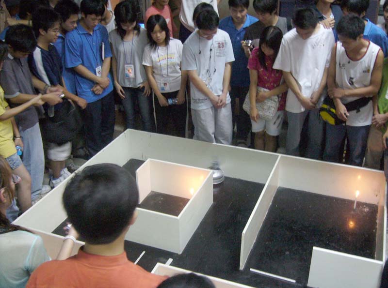 比赛前,参赛者对机器人编写灭火的程序,随后,比赛正式开始。队员把机器人放在灭火模式框内,框内预先点好4支蜡烛,灭火时间最长为5分钟,谁以最快的时间灭得最多蜡烛为之赢。经过了一场激烈竞争后,计算机技术系获得非专业第一名计04自动化获得专业组第一名。