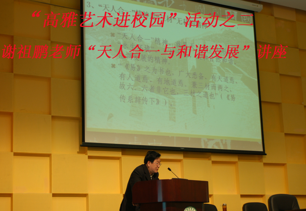 11月23日,我院人文社科系教授谢祖鹏在学术交流中心开设了“天人合一精神与和谐发展”讲座。作为我院“高雅艺术进校园”系列活动之二,学院领导、中层干部及全院教师参加了本次讲座。