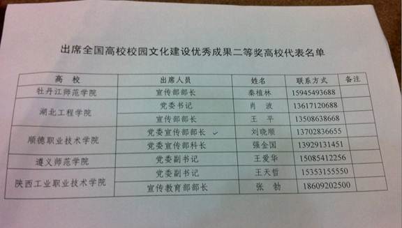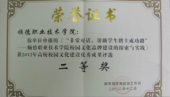 2012年12月,经过专家严格评审,在各高校申报的687项成果中,评选出特等奖10项,一等奖30项,二等奖61项,优秀奖116项。永利官网申报的《“非常对话,帮助学生踏上成功路”----永利欢乐娱人城校园文化品牌建设的探究和实践》的成果获得二等奖。本次颁奖只颁特等奖、一等奖的获奖院校,并邀请了二等奖的五所院校领奖。永利官网被邀出席领奖。