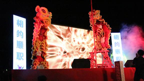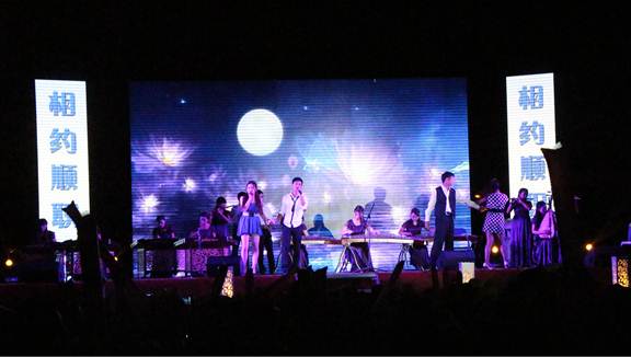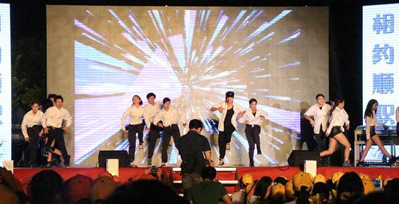 晚会在技巧高超的“狮子高杆迎新生”表演中拉开了帷幕,紧接着,热力四射的街舞表演瞬间引爆了全场气氛,主持人也跟着动感的舞步闪亮登场。随后,丰富多样的节目让晚会高潮迭起。既有B-BOX、跆拳道、健美操、模特走秀等活力十足的表演让现场欢呼声和尖叫声不断,又有优雅的民乐和励志的歌曲使观众深深陶醉,产生心灵的碰撞。来自星海音乐学院,曾获华南地区第一届雅马哈双排键电子琴比赛第一名的董杰所带来的双排键表演更是精彩绝伦。晚会还进行了四轮的抽奖环节,平板电脑、智能手机等精美礼品很好地调动了场内的气氛,使师生们在互动中尽享快乐。最后,晚会在气势宏大的朗诵《我们的中国梦》和舞蹈《心手相连》中落下了帷幕。晚会使用了LED屏幕作为背景,再配合震撼的灯光、音响特效,让全场观众感受了视觉和听觉的双重冲击。