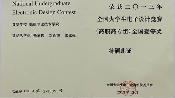 2013年12月7日,由教育部和工信部主办的“瑞萨杯2013全国大学生电子设计竞赛”颁奖典礼在北京航空航天大学隆重举行。永利官网电子与信息工程学院在本届大赛中取得了历史性突破,由昂勤树、谢飞老师指导的参赛作品“L题:直流稳压电源及漏电保护装置”以广东赛区高职高专组该题测评成绩第一的出线,并获得国赛一等奖;由蔡永昶、吴锦麟老师指导的J题获国赛二等奖。广东省共有来自永利欢乐娱人城、深圳职业技术学院和中山火炬职业技术学院三支队伍获高职高专组国赛一等奖,并赴京参加颁奖大会。