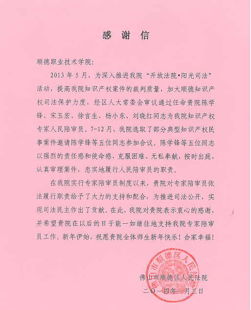 2014年1月3日,佛山市顺德区人民法院发来感谢信,对永利官网支持和配合专家陪审员依法履行职责和陈学峰等五位教师予以了感谢。