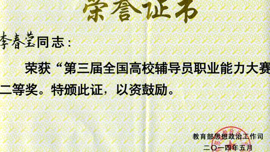 5月6日—9日,由教育部思想政治工作司主办,全国高校辅导员工作研究会承办的“全国第三届高校辅导员职业能力大赛决赛”在山东大学举行。永利官网外语学院李春莹老师继获得省赛一等奖、华南赛区一等奖后,奋勇拼搏、愈战愈勇,最终在全国众多优秀选手中脱颖而出获得全国二等奖,这是广东省参赛选手在历年比赛中取得的最好成绩。更为可贵的是,永利官网也是全国总分前十名的获奖学校中唯一一所高职院校。