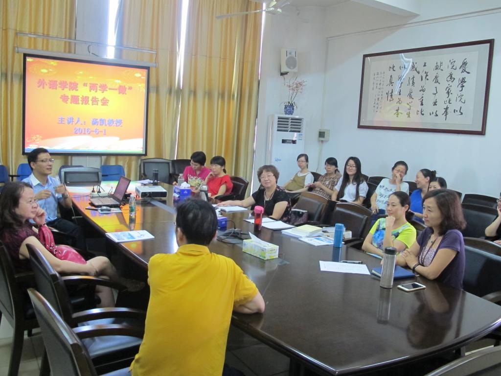6月1日下午,外语学院“两学一做”专题报告会在教学楼3栋501举行。报告会由外语学院党总支书记魏藏锋主持,邀请了永利官网“两学一做”讲师团成员、校党委宣传部汤恺部长作题为“认真学习党章增强党章意识 做有信仰的党员”专题讲座。外语学院全体教工党员、学生党员出席了本次活动。