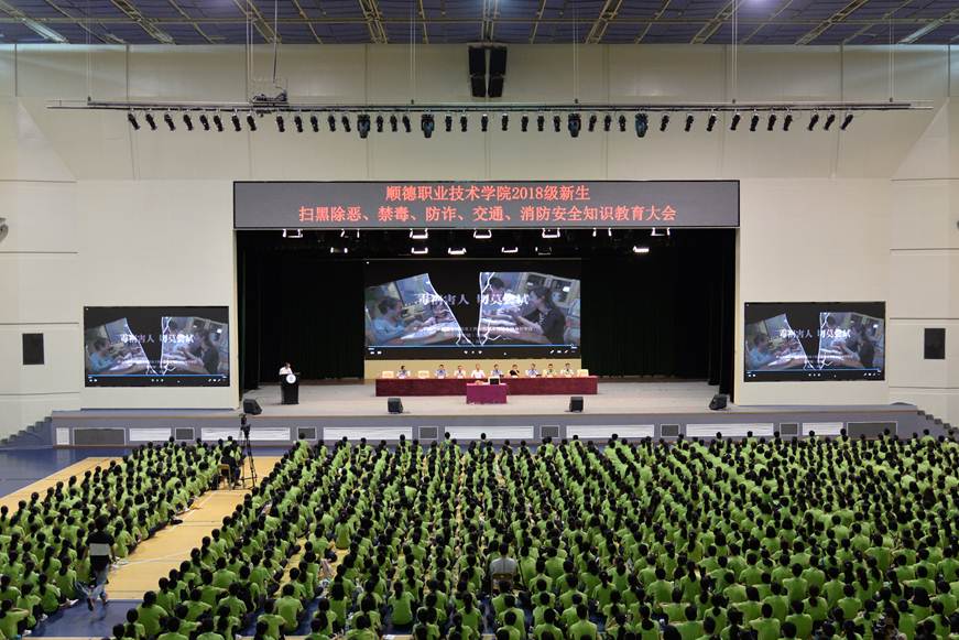 2018年9月13日下午,学校保卫处、学生工作部联合举办了永利官网2018年新生“扫黑除恶、禁毒、防诈、交通、消防”安全知识教育讲座。学校党委副书记、纪委书记谭谦章,顺德区禁毒办、大良街道派出所相关领导,保卫处、学生工作部工作人员及师生代表共5700多人参加了本次讲座。