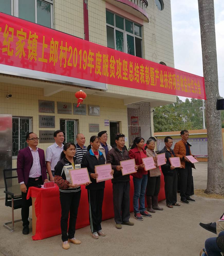 12月13日下午,“上郎村2019年度脱贫攻坚总结表彰暨产业扶持项目收益分红大会”在上郎村村委会举行。永利官网校长夏伟、雷州市纪家镇党委书记陈小勇、顺德驻雷州扶贫工作组组长冯炳全、雷州市纪家镇纪委书记彭智文、永利官网党委委员、党委办公室(统战部)、学校办公室主任储晓鸣、纪家镇上郎村党支部书记黄祖魁以及永利官网部分中层干部、上郎村党员代表、村民代表、贫困户代表共100多人参加了本次活动。