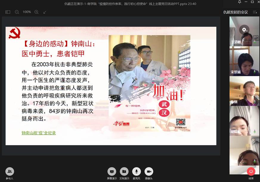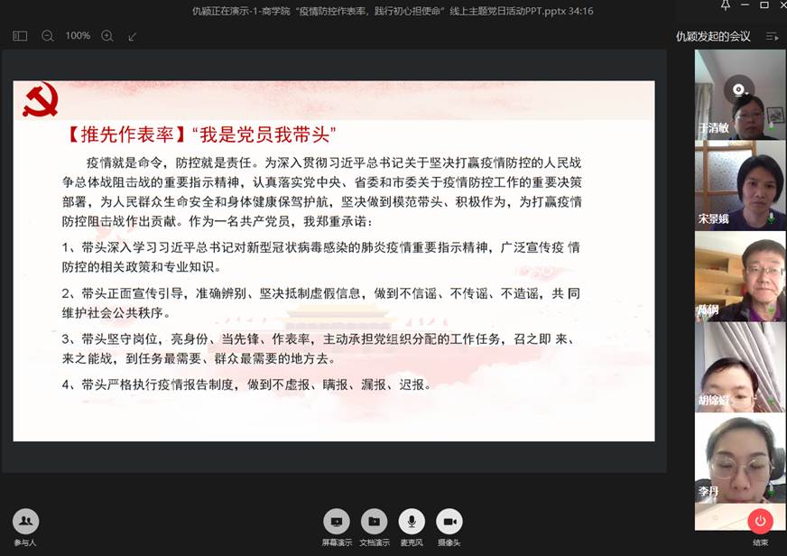 本次线上主题党日活动议程有三:一是重温入党誓词,时刻提醒党员同志们做到不忘践行初心、勇于当担使命;二是进一步了解新冠状病毒及目前的疫情防控形势,继续做好个人防护,服从学校、政府部门做好健康登记、行踪汇报等一系列信息填报工作,同时还学习了在最关键的疫情防控阶段逆向而行、无私奉献的钟南山院士、李兰娟院士先进事迹材料,还在线了解分享本教研室卢丽琴老师以及其家人赴湖北支持疫情防控的先进事迹。支部党员同志们感同身受,一致做了“我是党员我带头”的郑重承诺!三是回顾疫情防控期间以来,党员们都有做出了表率,均积极捐款,以实际行动关注、支持湖北武汉疫情。同时也做到了立足本职,率先做好停课不停学一系列工作,开学前全体党员就与学生们沟通,并积极搭建或寻找与课程相关的优质教学资源,财经党支部最早做好了网课授课计划,全部课程如期开展网络教学,并收到了良好的授课效果!