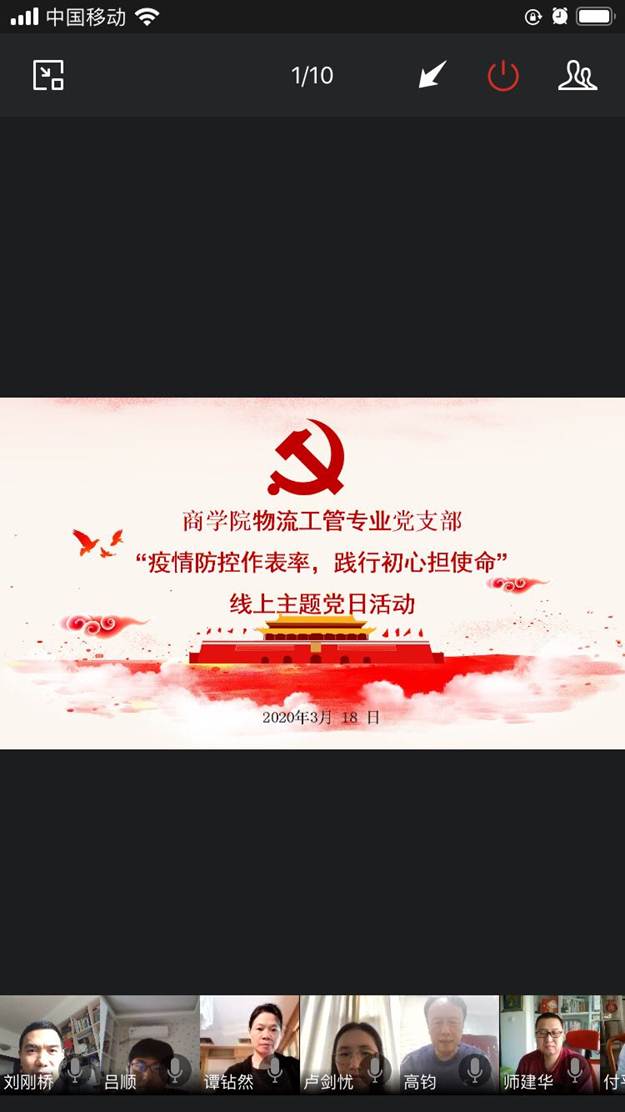 3月18日下午,商学院物流工管专业党支部开展了“疫情防控作表率,践行初心担使命” 线上主题党日活动。活动主要分为四个阶段:首先组织委员卢剑忧同志带领支部全体党员重温入党誓词,重温入党誓词让支部每位党员更加坚定自己的信念并努力实践;其次支部全体党员在线观看了新型冠状病毒预防须知的科普动画片,对如何做好预防有了更为深刻认识;接下来支部党员一起分享了“钟南山战疫全记录”和“李兰娟:忘我工作,每天只睡三小时”的先进事迹,并结合党中央教育部提出了“停课不停学”的号召与要求,纷纷介绍了各自疫情期间的工作情况,尤其是师建华同志分享了开学以来的在线授课心得,为其他党员同志提供了宝贵经验;最后全体党员在高钧院长和支部书记付平德同志的带领下一起进行了“我是党员我带头”的线上宣誓活动。
