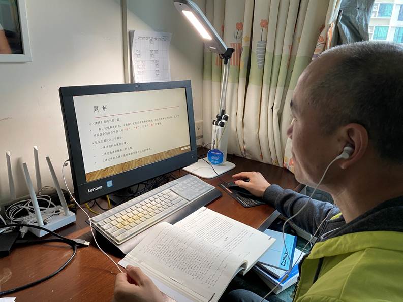 2月17日起,人文课程教研室的线上教学全面展开。老师们按照自己的线上授课方案有条不紊地开展教学。每个老师都根据自己的条件和情况选择了最佳的教学方案。对于张滴珍、陆可成这样的老教师而言,教学经验丰富是她们的优势,而信息技术薄弱是她们的软肋。张老师面对困难,迎难而上,不惜动用高级技术人才的儿子教她录网课,让饶晓明老师帮她发布作业。自己录讲解音频发到学习群。谢蔚老师一边照顾生病的母亲,一边在老公的帮助下学习录制网课。陆可成老师则是在身处香港的女儿的远程帮助下完成了视频的录制。王亮老师作为人文教师中为数不多的信息技术高手,给大家提供了视频录制教程和视频压缩服务。饶晓明老师在前三周时间里学习并采用了QQ、沃米易学、腾讯课堂三个平台进行直播。然后根据学生的反馈和平台的功能,最后稳定在用腾讯课堂进行网络直播,用永利欢乐娱人城在线教育综合平台布置学习任务和课程作业,进行在线测试。因为女儿面临高考,每天都在上着网课,所以他每次直播都要找个宁静的角落。