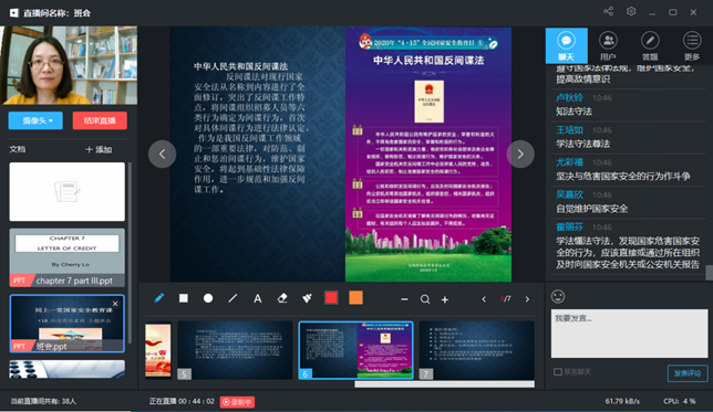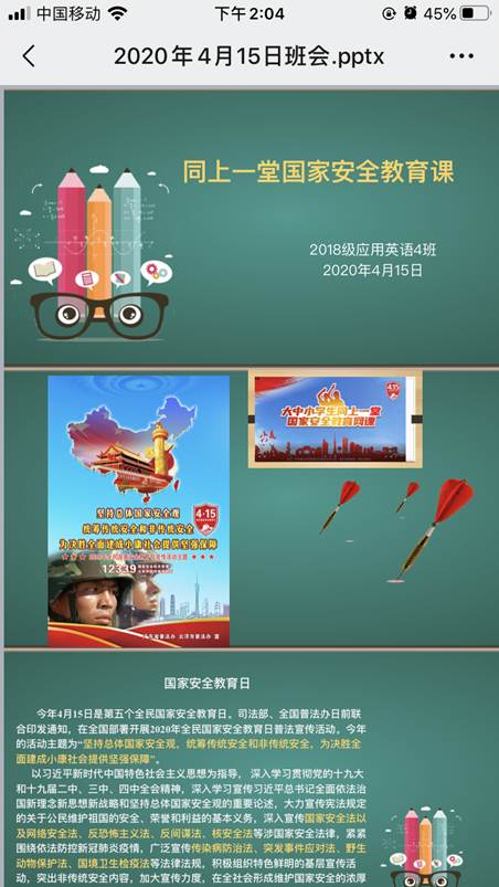 在学院广泛动员下,各班主任积极投入到班会前期准备工作中,组织同学们提前学习由教育部录制的国家安全教育日高校公开课、观看“国家安全”教育短片以及完成相关调查问卷等等。4月15日全民国家安全教育日当天,通过“职教云”、“易班平台”、“QQ群课堂直播”、“钉钉直播”、“微信群”、“线上测试问答”等多种平台及形式开展班会,班会主要围绕以下三个方面的内容展开。