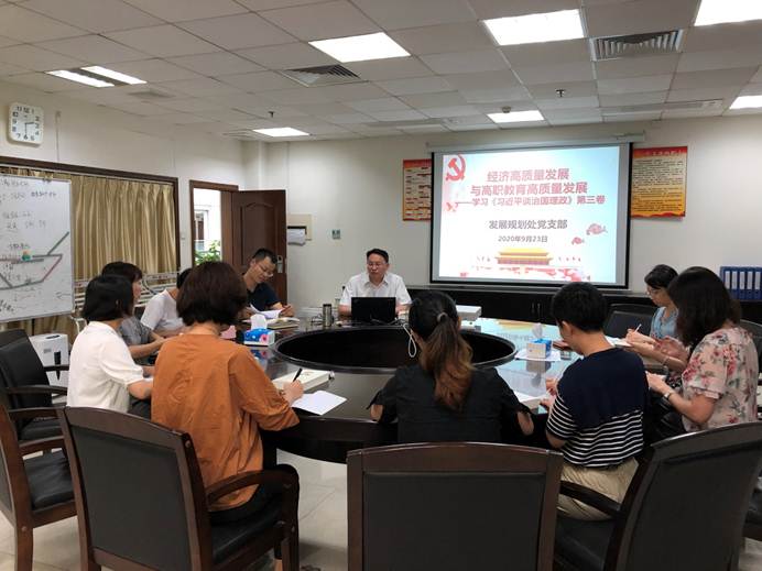9月23日下午,发展规划处党支部在行政楼6楼会议室召开全体党员会议,组织学习“经济高质量发展与高职教育高质量发展——学习《习近平谈治国理政》第三卷”。党支部书记肖坤主持学习会。
