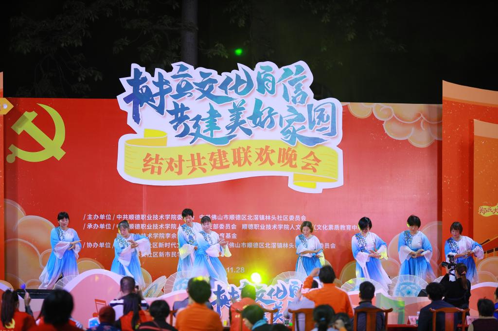 11月28日晚上,人文学院党总支与顺德区北滘镇林头社区党委联合举办了主题为“树立文化自信·共建美好家园”的美育现场结对共建联欢晚会。这场晚会在北滘镇林头社区党群活动中心举行,顺德区委宣传部副部长、区文联主席何鸿佳,学校党委委员、组织人事处处长陈文海,林头社区党委书记梁志能,第一书记何志锋,人文学院党总支副书记、院长刘晓顺,人文学院党总支书记李玉春,林头社区党委副书记梁伟锋,以及人文学院60多名师生党员、20多名学生演职人员、近400名林头社区群众参与了本次晚会。